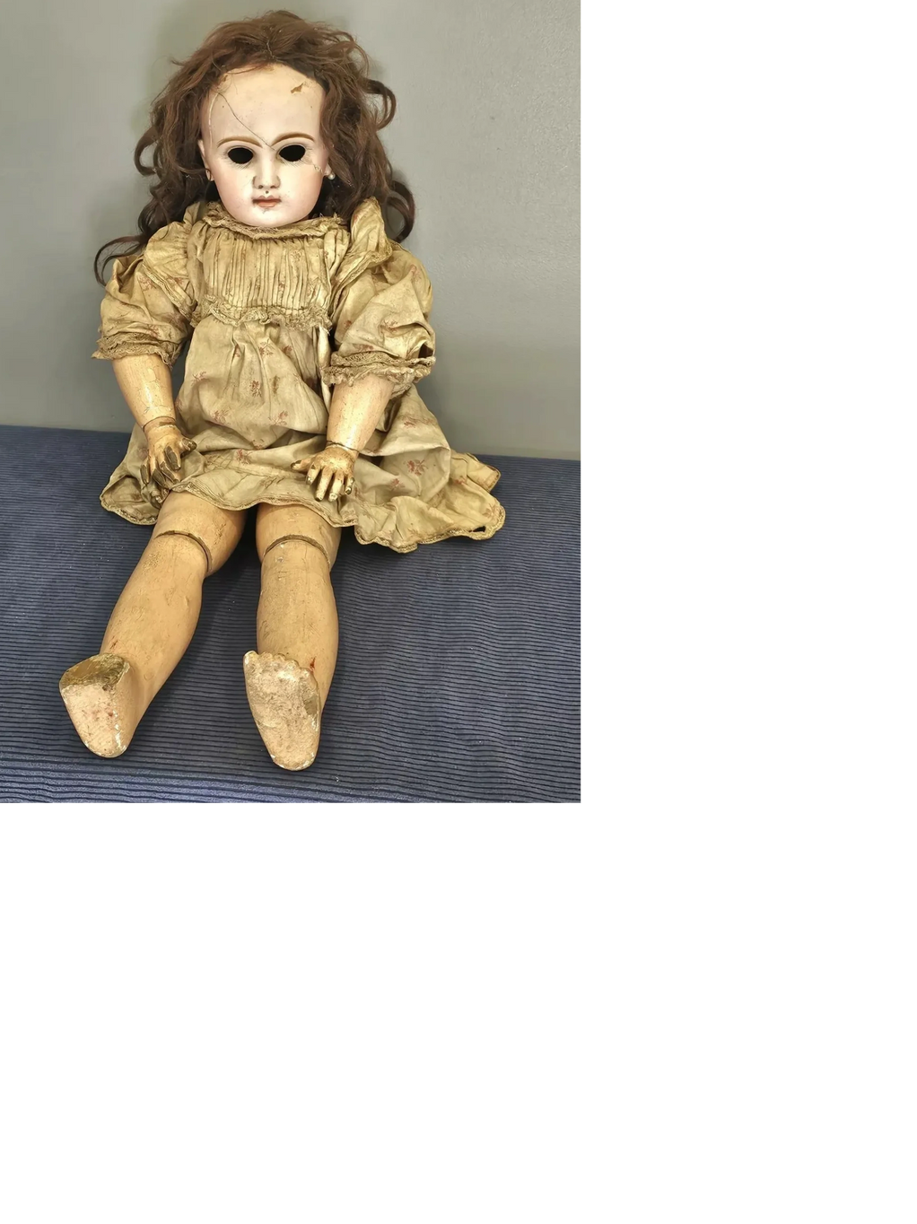 This poor little Jumeau 8 was in a terrible state when I first bought her, but what attracted me to her is that she had her original clothing, wig and cork pate. Her head was in many pieces, had no eyes and had been very badly repaired.